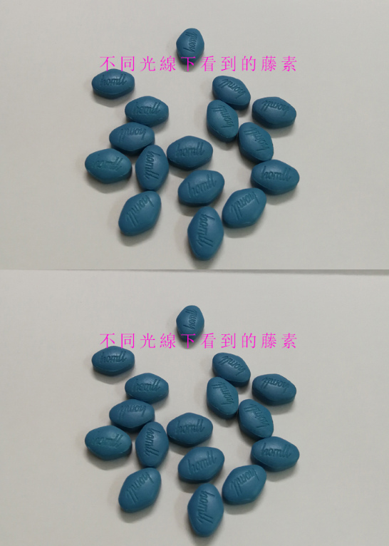 正品的日本藤素藥片的顏色是藍色的。 那顏色是紅根草特有的顏色。 我們無法描述它。 你可以看看圖片。 我們可以找出幾張假藥的圖片,對比一下就清楚了。 對比一下藥丸 因為日本藤素的成分是植物性的,所以提取出來做成藥丸後,還是會有那種天然的藍綠色,顏色飽和度足夠,不像假藥那樣的天藍色,只是 像染料一樣,仔細看能感覺到假藥的顏色像貝殼,但是正品日本日本藤素藥片顏色不太一樣,是跟藥丸
